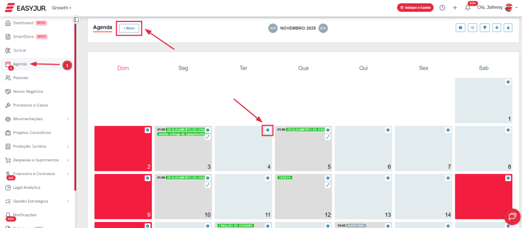 Iniciar a criação de uma agenda clicando no botão “+NOVO” no canto superior esquerdo ou no “+” localizado na agenda em modo calendário. A partir daí, você iniciará o cadastro do evento.