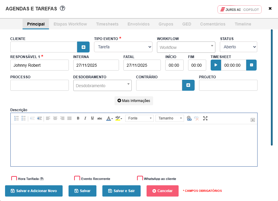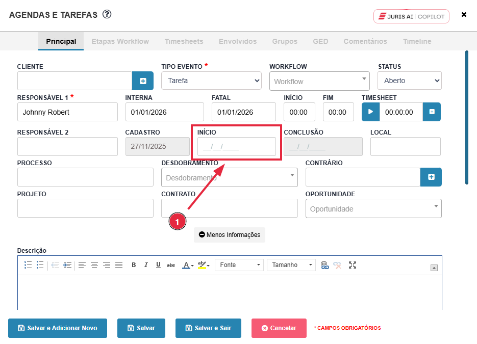 Após clicar nos botões indicados anteriormente, uma nova janela será aberta, onde você poderá iniciar o cadastramento da tarefa.