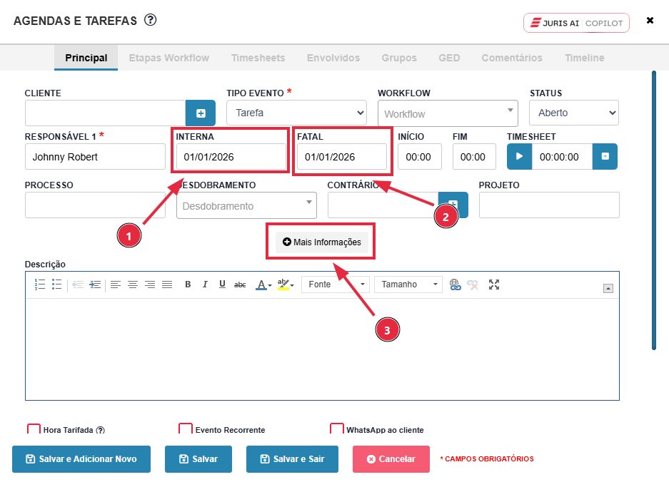 Logo após essa nova janela abrir, você poderá inserir os dados necessários para a abertura da agenda. Nesta janela, você configurará a data interna e a data fatal do evento que será realizado. Antes de inserir um workflow, é necessário definir a data de início do evento. Somente após definir a data de início, você poderá configurar um workflow, caso deseje. Para encontrar onde colocar a data de início, clique no botão “Mais Informações”.