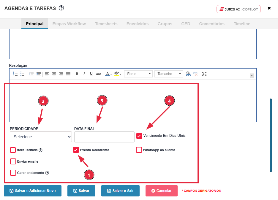 Por fim, você pode optar por considerar apenas dias úteis para o vencimento do evento. Ao marcar a opção “Vencimento em Dias Úteis”, os agendamentos serão automaticamente ajustados para cair apenas em dias úteis, evitando finais de semana e feriados. Isso garante que os prazos e compromissos sejam sempre estabelecidos em dias de expediente, facilitando o cumprimento e gerenciamento das atividades.