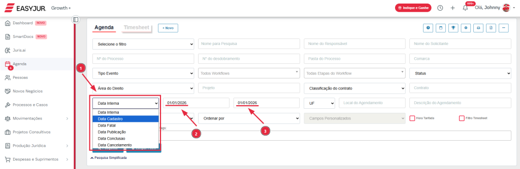 Clique no campo “Data Interna” e troque para “Data Cadastro” e preencha os campos da data inicial e da data final com a data que você criou o agendamento recorrente.