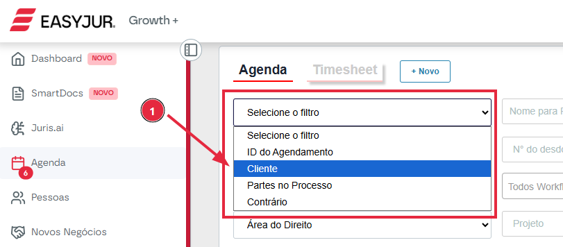 Se os agendamentos criados de forma recorrente tem cliente vinculado, clique no campo “Selecione o filtro” destacado na figura abaixo e escolha a opção “Cliente“.