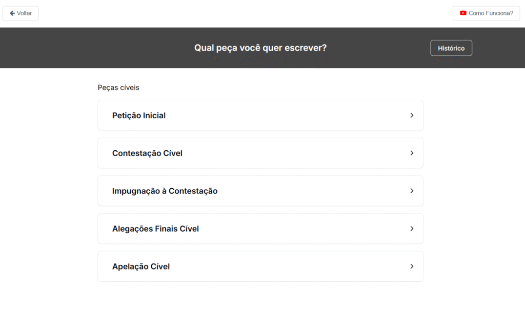 - O usuário inicia selecionando o tipo de peça/Documento a ser produzido, por exemplo, uma Contestação Cível.
