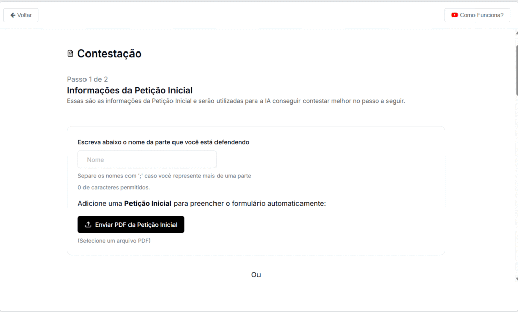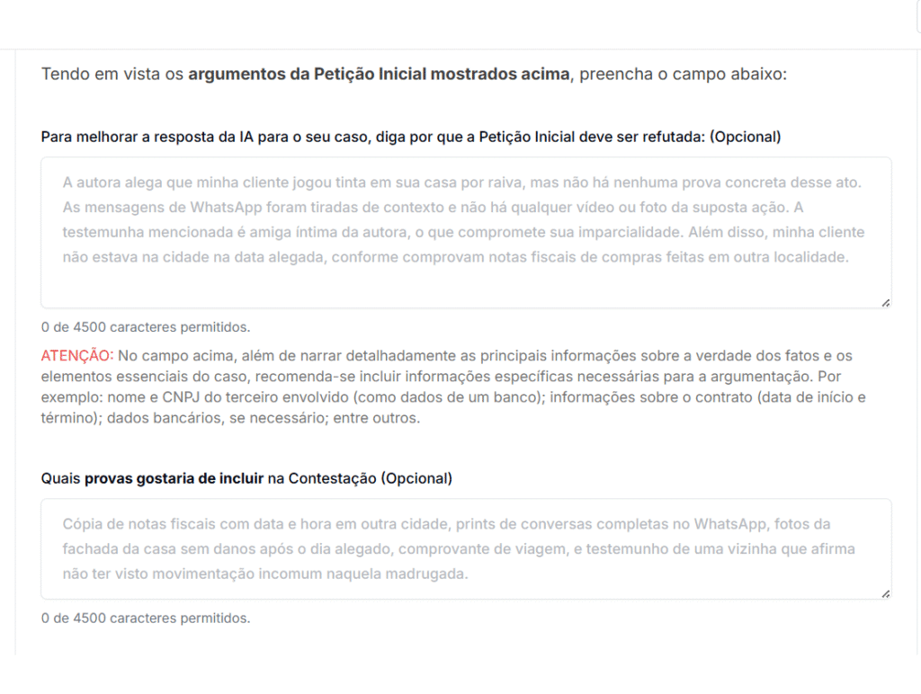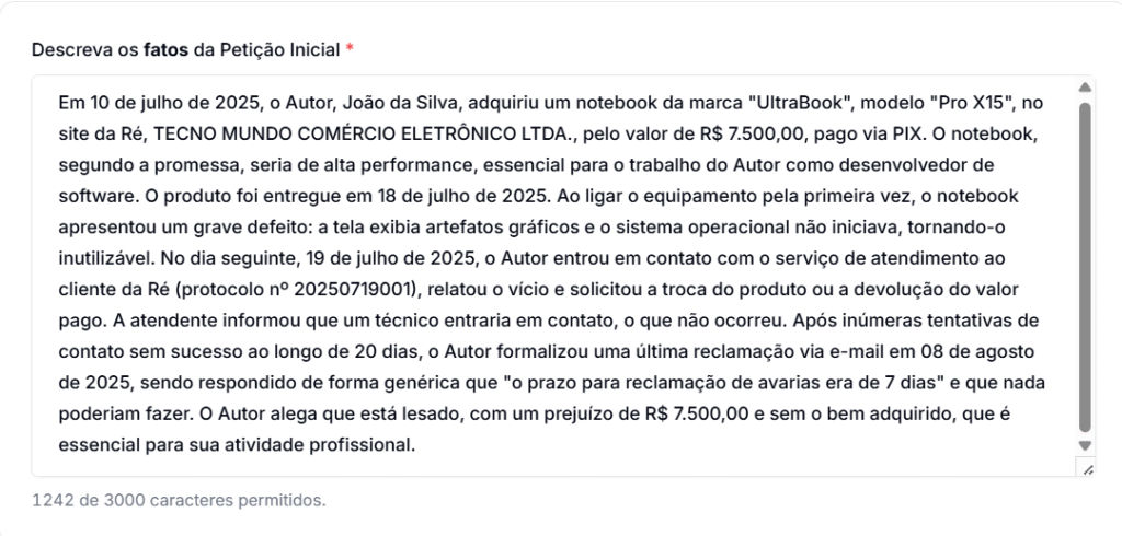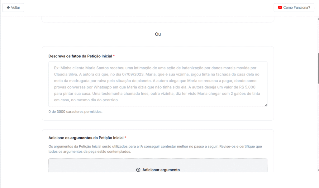 - Preenchimento Manual (Alternativa): Caso prefira, o usuário pode preencher manualmente os campos de informações da petição inicial, como fatos e argumentos. No entanto, a economia de tempo é maior com o upload do PDF.