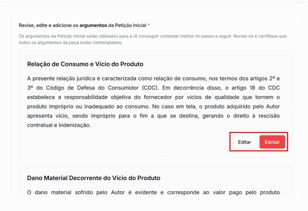 - Após o upload, a ferramenta extrai e apresenta os fatos e argumentos principais da petição inicial.