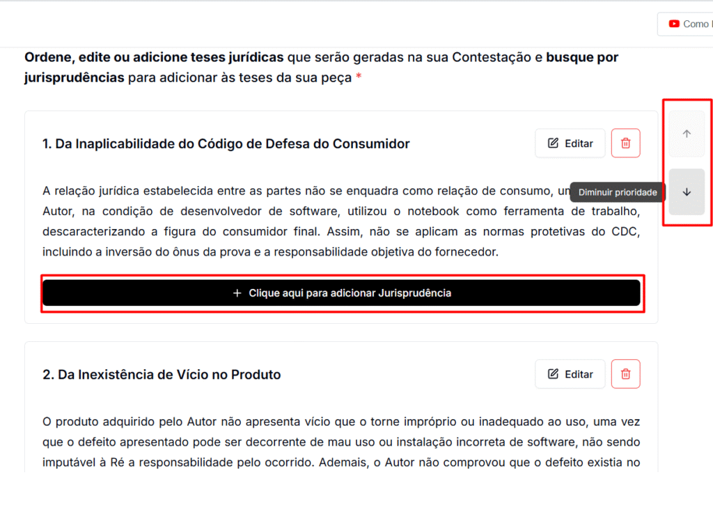 - Reordenação e Adição de Teses: As teses podem ser reordenadas, e o advogado pode adicionar novas teses, buscando jurisprudências também para elas.