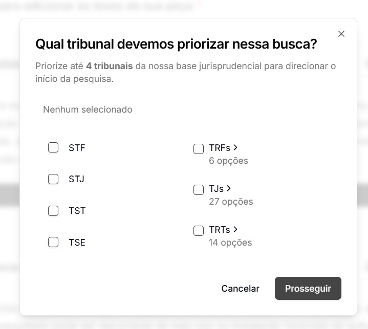 - Seleção de Tribunais: O usuário pode selecionar os tribunais para a busca (Tribunais Superiores, Regionais Federais, de Justiça Estaduais e TRTs), com um limite de quatro tribunais por busca.