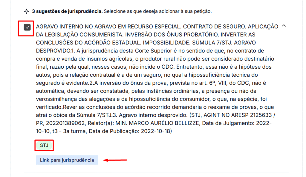 - Verificação: É crucial que o advogado confira as jurisprudências. A ferramenta oferece um link direto para o site da jurisprudência, permitindo verificar a coerência e garantir a exatidão da informação apresentada.