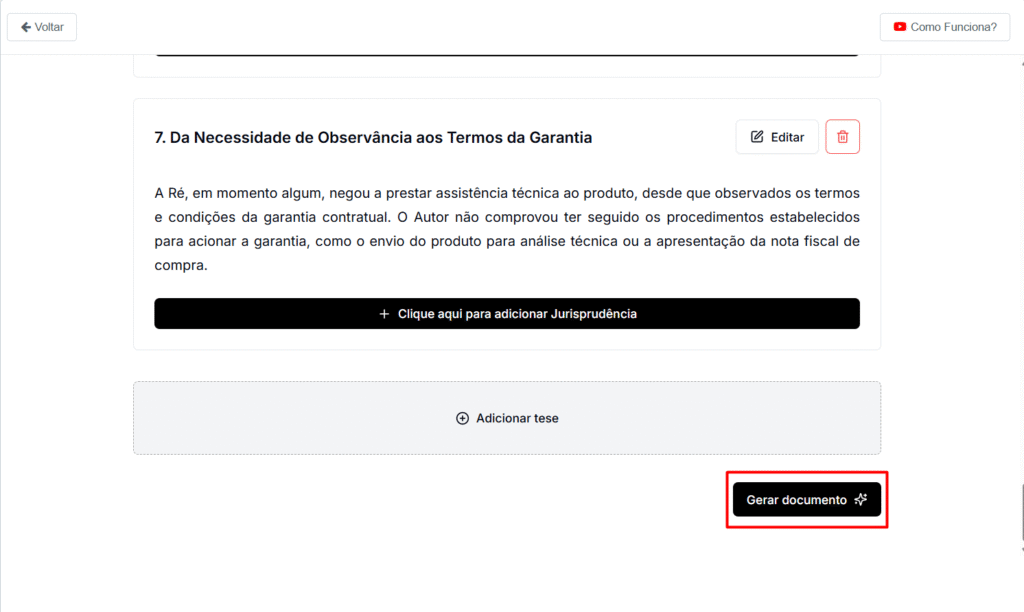- Após revisar as teses e jurisprudências, o usuário clica para gerar o documento.