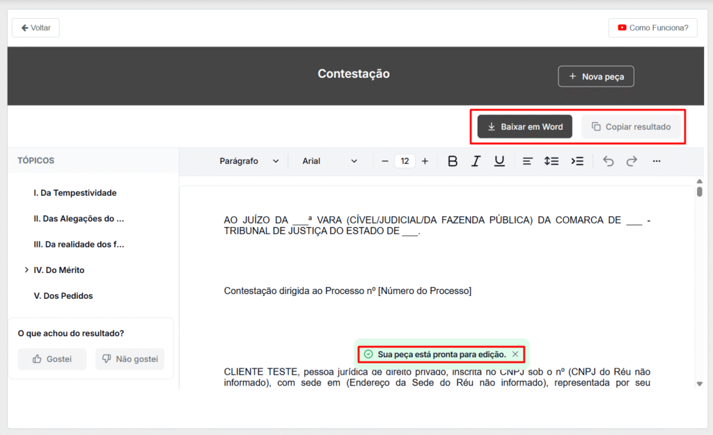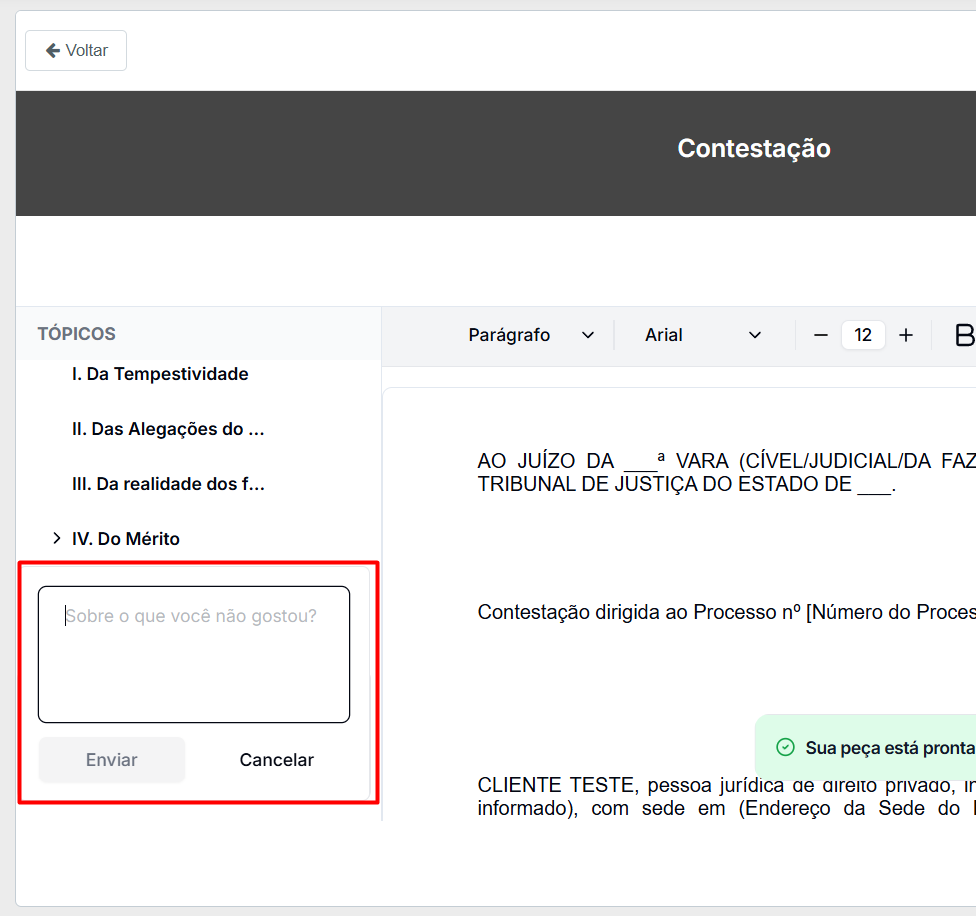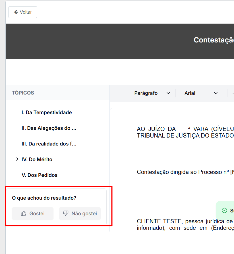 - Como Fornecer Feedback: Ao final da geração do documento, há uma opção para dar feedback sobre o resultado, indicando se gostou ou não. Em caso negativo, o usuário pode deixar comentários detalhados sobre o que faltou, o que a IA errou ou o que deveria ter feito.