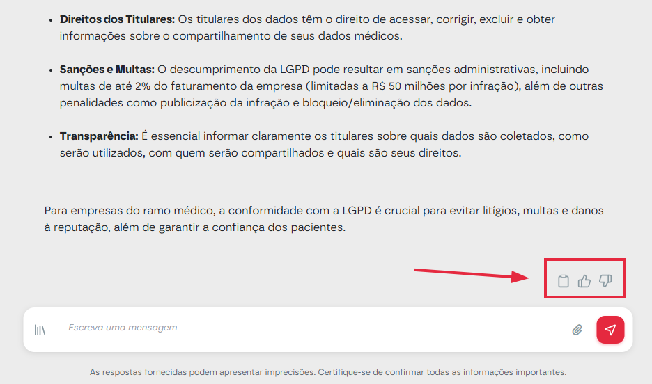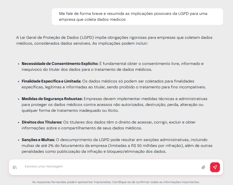 Após submeter sua mensagem, o JurisAI irá automaticamente preparar a sua resposta. No caso abaixo, solicitamos implicações da LGPD para um caso específico.
