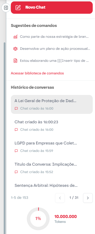 Nesta barra lateral pode-se ver o histórico de conversas de todo o seu escritório com o JurisAI, conforme a imagem abaixo:
